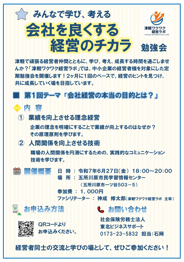 【社会保険労務士】6月27日に「津軽の経営者」で勉強会をします|東北ビジネスサポート